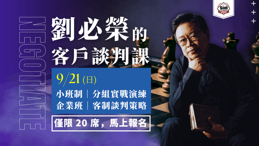 劉必榮教授於9/20(六) 將拆解經典談判案例過程中的每個環節,從準備、開場、中場到收尾,涵蓋全面的戰術和策略,讓學員在不同的談判情境中游刃有餘。